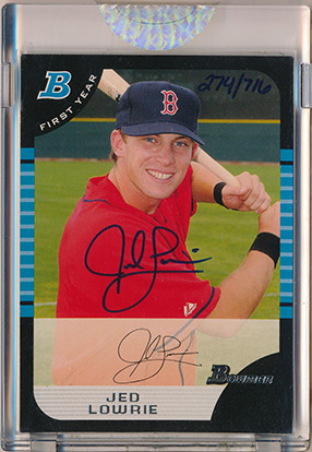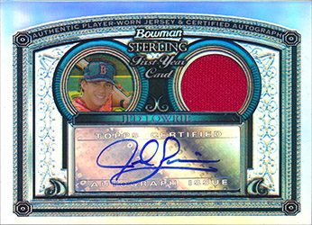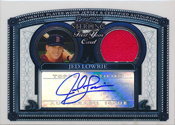 ![]() 2005 Bowman Sterling Jersey Autograph Refractor #BS-JL Jed Lowrie RC 090/199 |