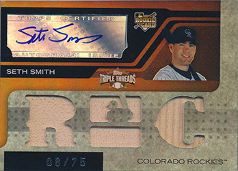![]() 2008 Topps Triple Threads Jersey/Autograph Sepia #158 Seth Smith 08/75 |