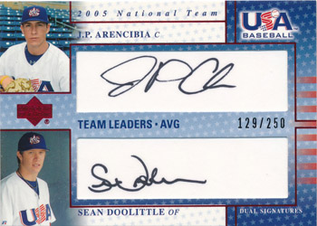 ![]() 2005-06 USA Baseball National Team Leaders Dual Signatures Black #TL1 Arencibia/Doolittle 129/250 |