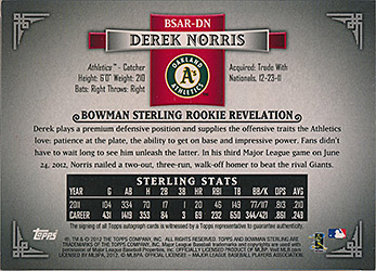 ![]() 2012 Bowman Sterling Rookie Autographs Gold Refractors #BSAR-DN 29/50 |