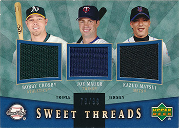 ![]() 2004 Sweet Spot Sweet Threads Triple #STT-CMM Bobby Crosby/Joe Mauer/Kazuo Matsui 79/99 |
