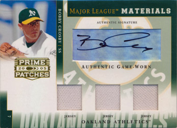 ![]() 2005 Prime Patches Major League Materials Autograph Triple Swatch #MLM44 2/3 BGS 9 |