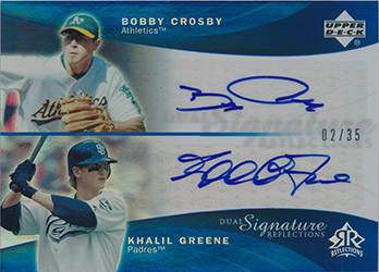 ![]() 2005 Reflections Dual Signatures Blue #BCKG Bobby Crosby/Khalil Greene 02/35 |