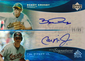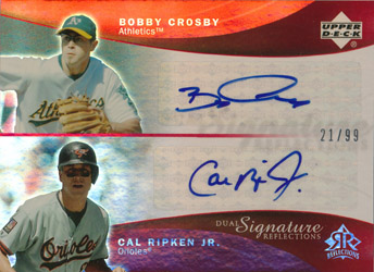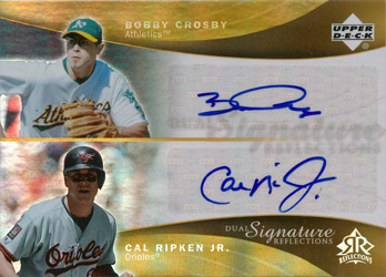 ![]() 2005 Reflections Dual Signatures #BCCR Bobby Crosby/Cal Ripken Jr. (print run: 75) |