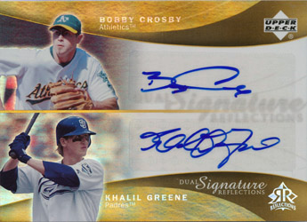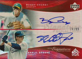 ![]() 2005 Reflections Dual Signatures Red #BCKG Bobby Crosby/Khalil Greene 74/99 |