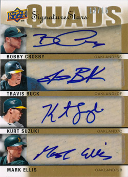 ![]() 2009 Upper Deck Signature Stars Signature Quads #S4-HBSE Crosby/Buck/Suzuki/Ellis 12/15 |
