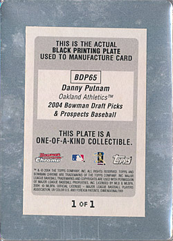 ![]() 2004 Bowman Chrome Draft Printing Plate Black #BDP65 Danny Putnam 1/1 |