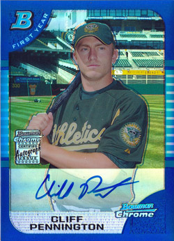 ![]() 2005 Bowman Chrome Draft Blue Refractors Autograph #BDP174 Cliff Pennington RC 014/150 |
