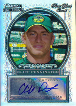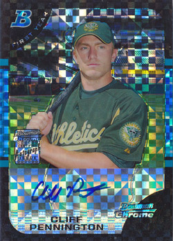 ![]() 2005 Bowman Chrome Draft X-Fractors Autograph #BDP174 Cliff Pennington RC 150/250 |