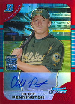 ![]() 2005 Bowman Chrome Draft Red Refractors Autograph RC #BDP174 Cliff Pennington 1/1 |