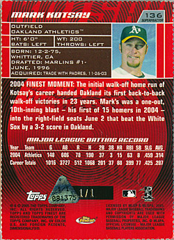 ![]() 2005 Finest Superfractors #136 Mark Kotsay 1/1 |