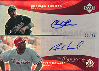 ![]() 2005 Reflections Dual Signatures Red #CTRH Charles Thomas/Ryan Howard 89/99 |
