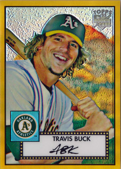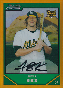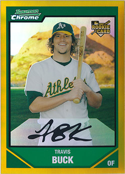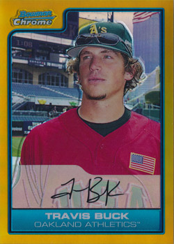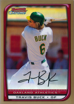 ![]() 2008 Bowman Chrome Gold Refractors #140 Travis Buck 06/50 |