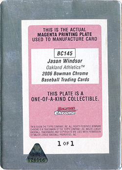 ![]() 2006 Bowman Chrome Prospects Printing Plate Magenta #BC145 Jason Windsor 1/1 |