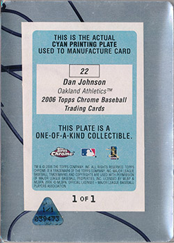 ![]() 2006 Topps Chrome Printing Plate Cyan #22 Dan Johnson 1/1 |