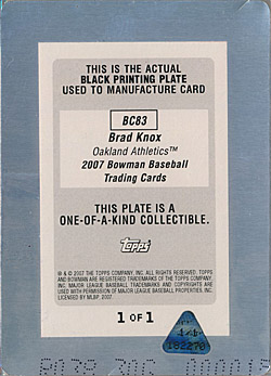 ![]() 2007 Bowman Chrome Prospects Printing Plate Black #BC83 Brad Knox 1/1 |