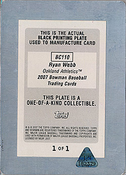 ![]() 2007 Bowman Chrome Prospects Printing Plate Black #BC110 Ryan Webb 1/1 |