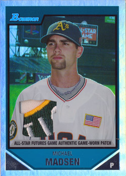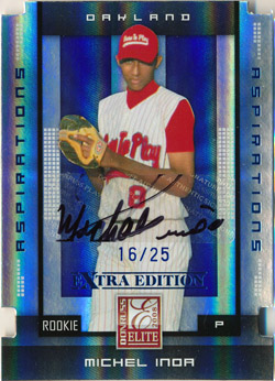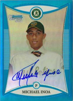 ![]() 2008 Bowman Chrome Draft Prospects Blue Refractors Autograph #BDPP142 Michael Inoa 109/150 |