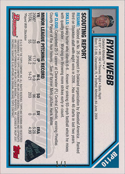 ![]() 2007 Bowman Prospects Red #BP110 Ryan Webb 1/1 |