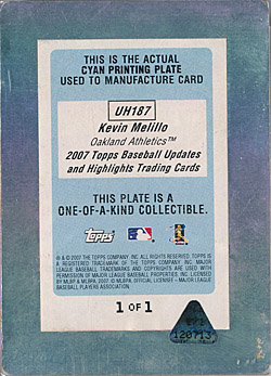 ![]() 2007 Topps Update Printing Plate Cyan #UH187 Kevin Melillo 1/1 |