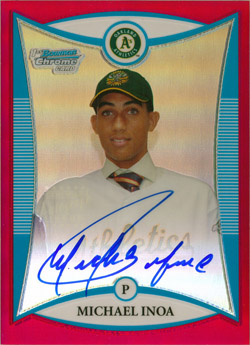 ![]() 2008 Bowman Chrome Draft Prospects Red Refractors Autograph #BDPP142 Michael Inoa 4/5 |