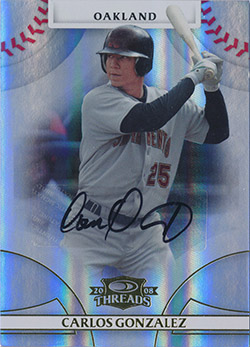 ![]() 2008 Donruss Threads Signatures Gold #82 Carlos Gonzalez 814/975 |