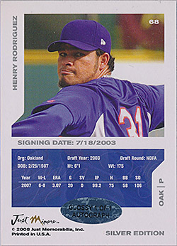 ![]() 2008 Just Signing Date Silver Edition Glossy Autograph #68 Henry Rodriguez 1/1 |