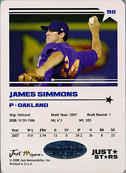![]() 2008 Just Stars Autographs Press Plate Black #98 James Simmons 1/1 |