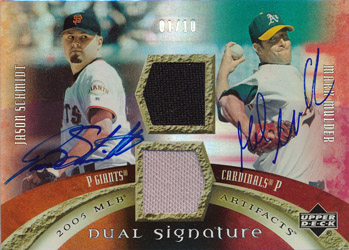 ![]() 2005 Artifacts Dual Artifacts Signatures #DA-SM Jason Schmidt/Mark Mulder 01/10 |