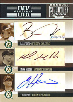 ![]() 2005 Donruss Signature INKcredible Trios #IS36 Zito/Mulder/Hudson (print run: 37) |