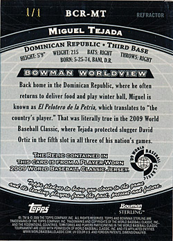 ![]() 2009 Bowman Sterling WBC Relics Red Refractors #BCR-MT 1/1 |