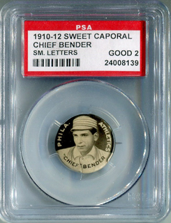 ![]() 1910-12 Sweet Caporal Pins Chief Bender Small Letters, PSA 2 |