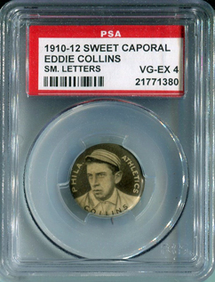 ![]() 1910-12 Sweet Caporal Pins Eddie Collins Small Letters, PSA 4 |