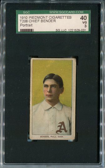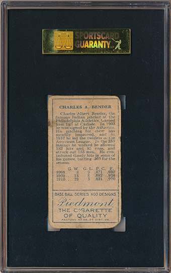 ![]() 1909-11 T206 Chief Bender Portrait Piedmont Back, SGC 40 |