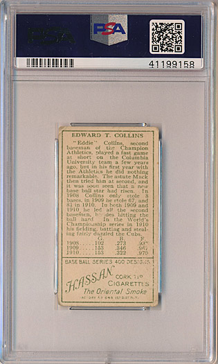 ![]() 1909-11 T206 Eddie Collins Sweet Caporal Back, PSA 2 |