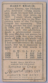 ![]() 1909-11 T206 Harry Krause (pitching) Piedmont Back |