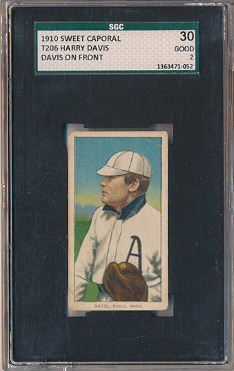 ![]() 1909-11 T206 Harry Davis (throwing) Sweet Caporal Back, SGC 2 |
