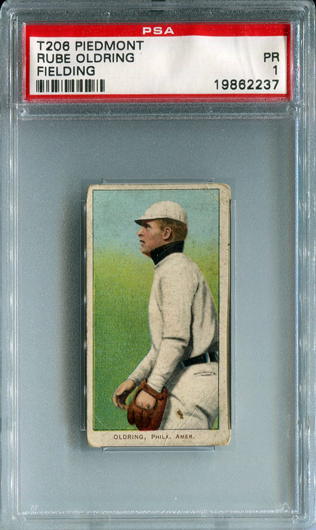 ![]() 1909-11 T206 Rube Oldring Fielding Piedmont Back, PSA 1 |