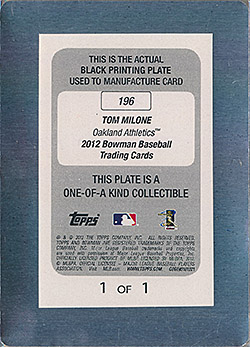 ![]() 2012 Bowman Printing Plate Black RC #196 1/1 |