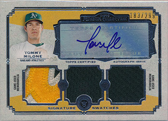 ![]() 2013 Topps Museum Collection Signature Swatches Triple Relic Autographs #SSATR-TM 183/299 |